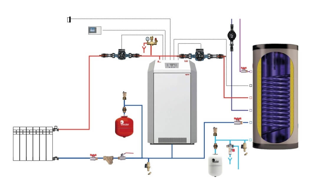 В этот же контур отопления подцепляется бойлер косвенного нагрева, который примерно по объему не меньше 80 литров должен быть, 150−200, в зависимости от того, какое потребление горячей воды вы планируете в своём доме.